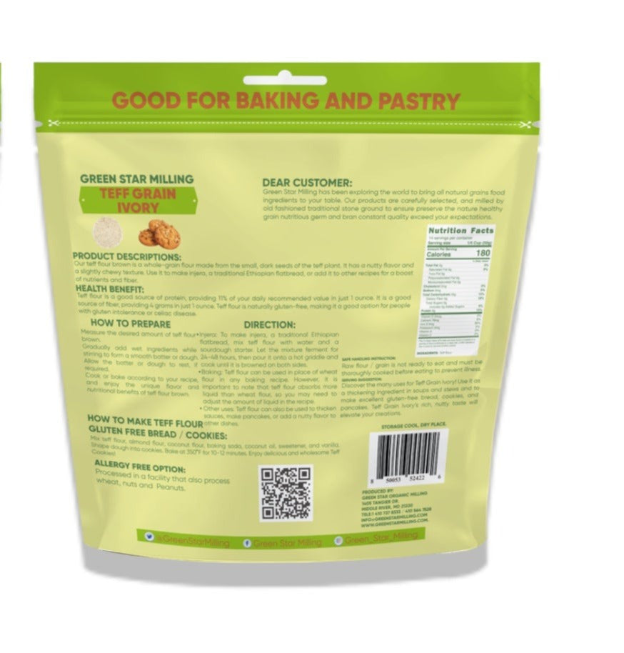 Teff grain, known as ivory teff, is a gluten-free ancient grain with a mild, nutty flavor. It is rich in iron, calcium, and fiber, making it a nutritious choice. Ivory teff is versatile, used in baking, porridge, and as a base for injera, a traditional Ethiopian and Eritrean flatbread.